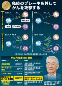 この発見は、免疫の抑制を解除して免疫細胞でがんを攻撃させる「免疫チェックポイント阻害剤」という画期的な「免疫療法(オプジーボなど)」につながり、多くのがん患者を救う道を開いたことが評価されています。